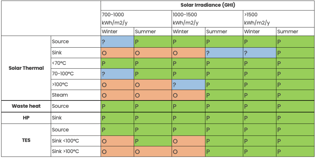 As an example, a location with solar irradiance (GHI) of 1’100kWh/m2/year, may use an integrated solution combining ST (as heat source <100°C), WH (heat source), HP (heat sink) and TES (heat source <100°C) during both winter and summer time. At the same location, generation of solar heat >100 °C may not be feasible during the winter period.